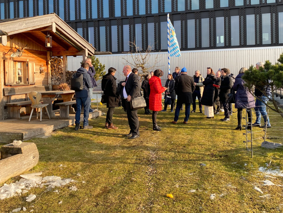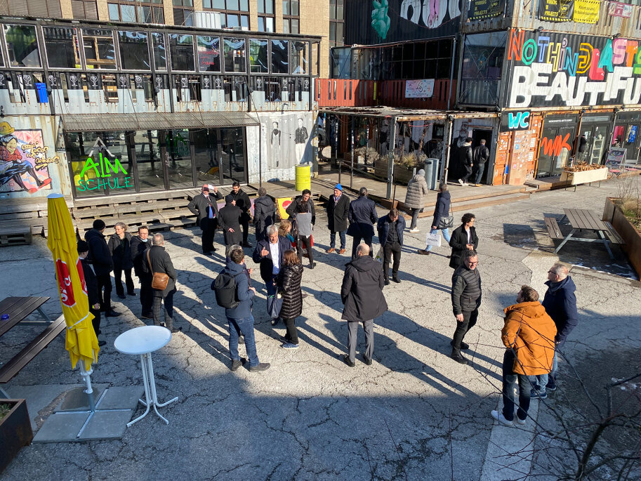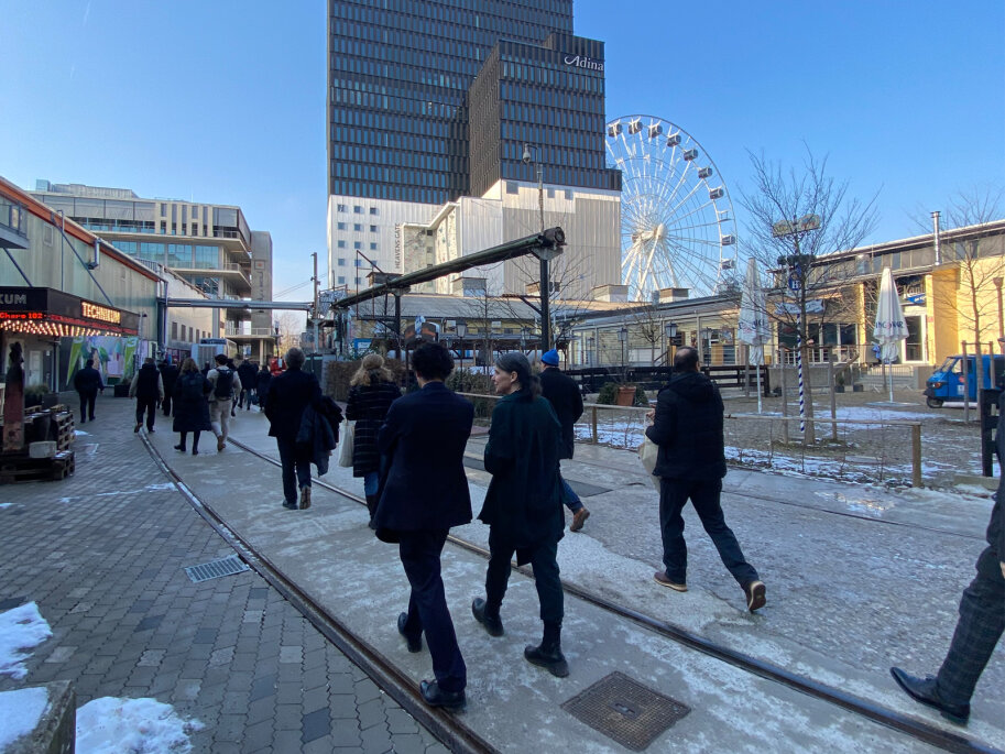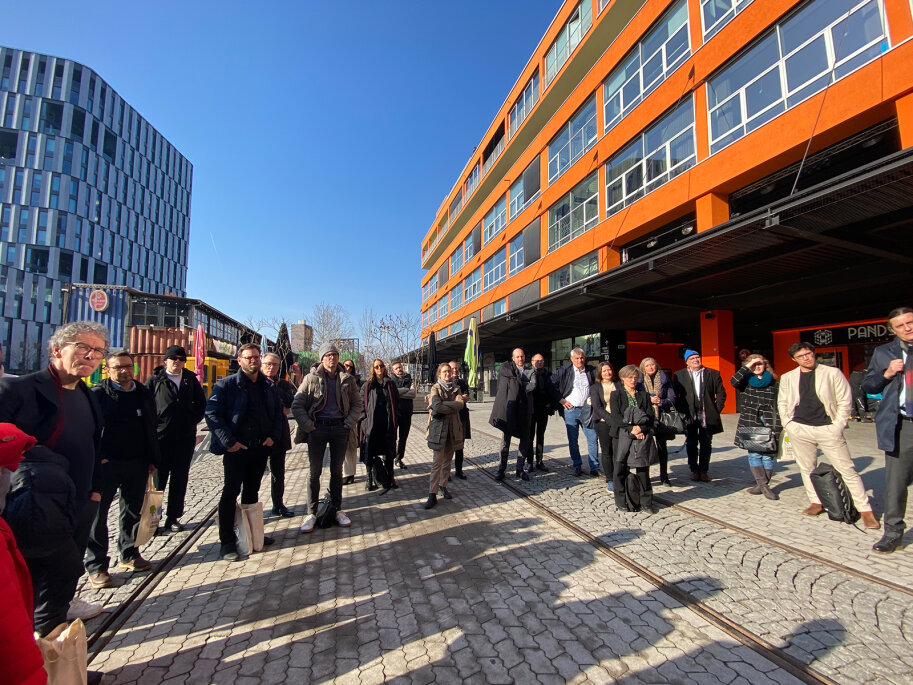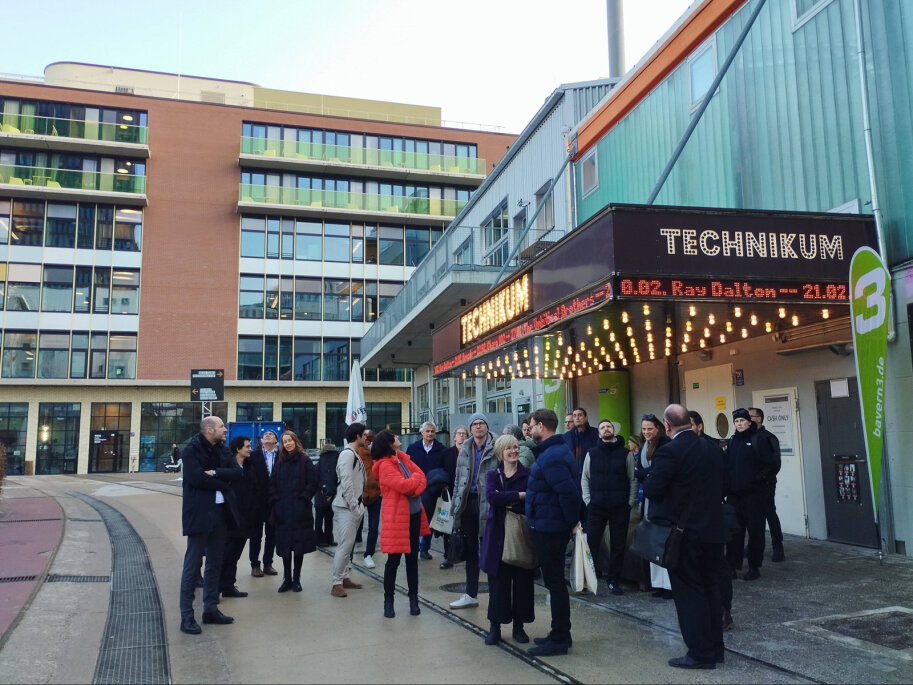 Nach der Abschlussveranstaltung des Modellprojekts LANDSTADT BAYERN am 20. Februar 2025 haben sich zahlreiche Teilnehmende der Exkursion zum Münchner Werksviertel angeschlossen. Unter der fachkundigen Leitung vom Büro Steidle Architekten und von der Eventfabrik München GmbH erhielten die Teilnehmenden einen eindrucksvollen Einblick in die Transformation des ehemaligen Industrieareals, das aufgrund der herausragenden Planung und städtebaulichen Qualitäten mit dem Deutschen Städtebaupreis 2023 ausgezeichnet wurde.