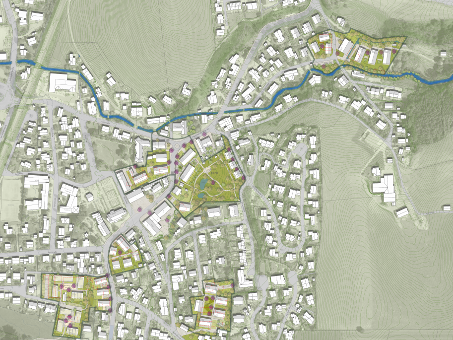 Ein städtebaulicher Wettbewerb brachte innovative Ideen für die vier innerörtlichen Areale hervor. Die Wettbewerbsentwürfe berücksichtigen die Bedürfnisse aller Generationen und verbinden Wohnen und Arbeiten so, dass sowohl Privatsphäre als auch Gemeinschaft gefördert werden. Der Siegerentwurf des Wettbewerbs wurde in einem Rahmenplan bedarfsorientiert weiterentwickelt und konkretisiert.