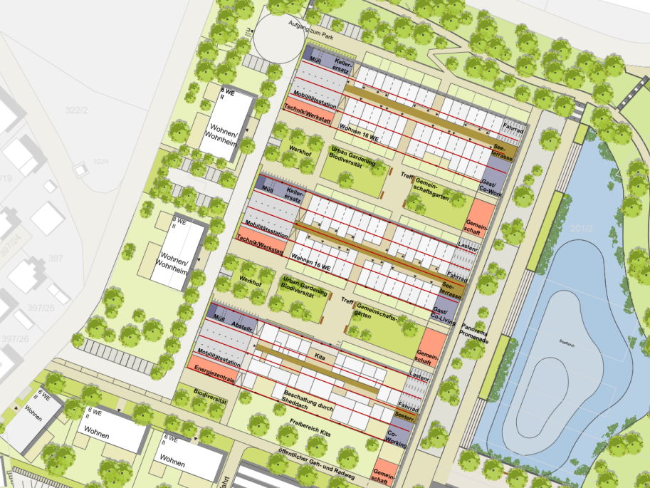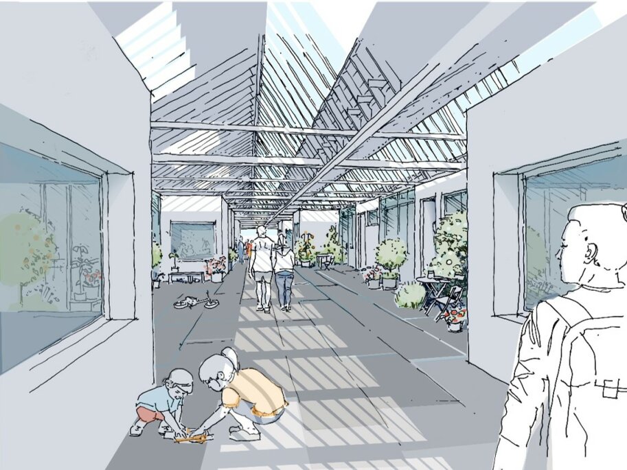 Die Planung in Mainleus ist beispielhaft für Qualitätssicherung und innovative Raumgestaltung. Sie setzt auf flexible Wohneinheiten und Platz für Co-Working. Zwischen den Gebäuden entstehen öffentliche und private Grünräume, die das Gemeinschaftsleben fördern. Zudem wird die Struktur des Hallendachs zur Basis des energetischen Konzepts. Darauf soll eine Photovoltaikanlage umgesetzt werden.